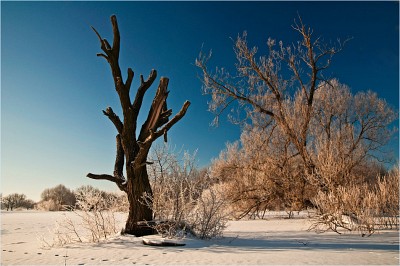 Правое и левое дерево равновеликие и конфликтуют в кадре, не создают единую композицию, ИМХО.