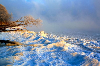 Рассвет. На мелководье, недалеко от берега всё покрыто шугой. Там, где начинается чистая вода, море парит...