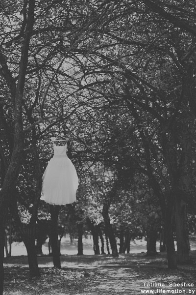 А свадьба - эт все таки праздник, радость, надежды, любовь, позитив... Я бы, лично, не обрадовался такой свадебной фотографии. Да и как самостоятельная карточка-тоже непонятно... Платье. На дереве. В лесу. Это что, невесту... хм... того-этого а платье повесили повыше, чтобы не достала?