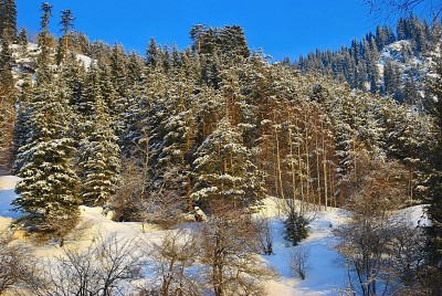 Но есть пара моментов, на которые обратил внимание. Почему снег местами желтый? Композиционно деревья (выделяющиеся среди других) в центре разделили снимок на две части, что не есть хорошо...