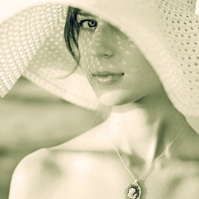 Вечерний бриз и прогулка по пляжу. глаза и ключицы. солнце сквозь шляпу. лето.