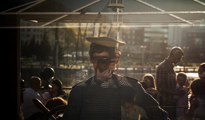 автопортрет, сделанный сквозь капитана корабля речного флота на закате