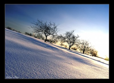 Интересные линии теней,горизонта и рисунка неба и цвета приятные- и впротивовес им разляпистая графика черных веток яблонь...