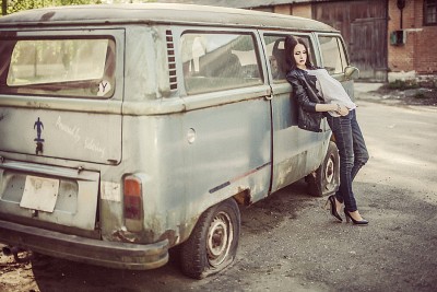 я не понял ничего. Какого черта она присланилась к этой машине со спущенными колесами, которая вся грязная, а сама она только что с подиума?!