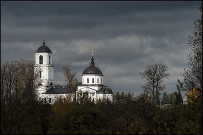 Красивый контраст светлого храма и мрачного неба. Интересный взгляд.