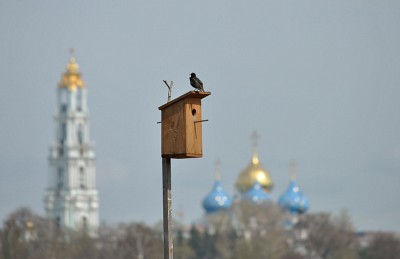 Скворец на фоне Свято-Троицкой Сергиевой Лавры )