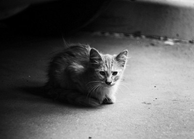 Такой вот котёнок во дворе живёт, один одинёшенек. Очень-очень пугливый, постоянно под машинами сидит. :(