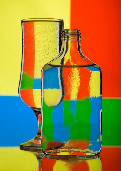 в бутылочку - водку, а в стакан водичку дистилированную, а рядом огурчик- солененький.:) Но это уже о другом натюрморт