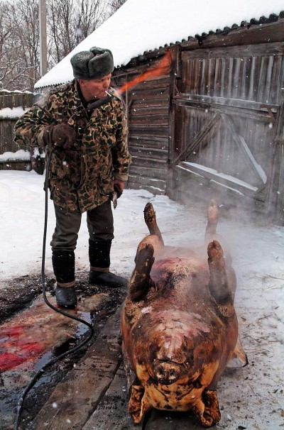 даа, тож столько раз наблюдал такое с детства и участвовал ...сельская жизнь ,однако ...) сверху уже побрили, теперь брюхо ...) когда он черный весь тоже колоритно ) любил на черном что-то нарисовать, прежде ,чем соскребать корочку ) .