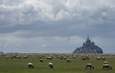 Beautiful sky, the sheep look like clouds on the grass, Saint-Michel is in the fog... Excellent photo.