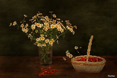 (единственное, я бы рассыпанные ягодки перед стаканом немного сместила ближе к корзинке....с расстановкой предметов надо поиграться)
