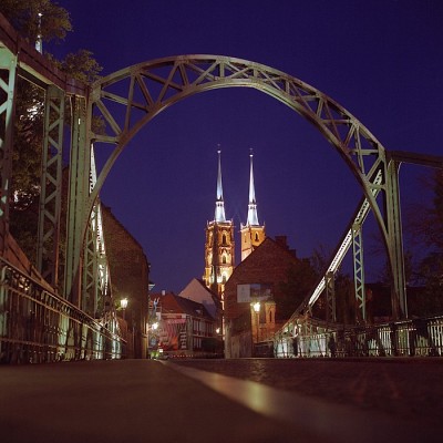 Польша, Вроцлав. Вид на катедру (кафедральный собор) с зеленого моста. Мост сам по себе интересный, в нем еще остались рваные раны от снарядов с войны.