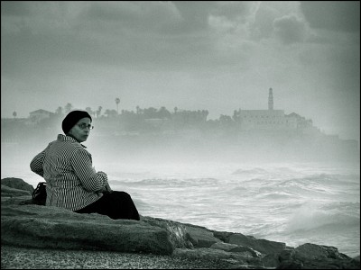 Набережная Тель-Авива и отдыхающая на камне религиозная дамочка, для которой фотосъёмка стала неожиданностью.