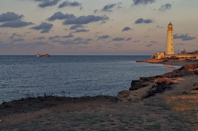 Крым. Мыс Тарханкут. Вид на маяк и затонувшее судно...Рассветные минуты...