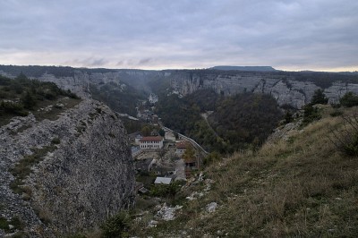 Старый Бахчисарай. Раннее утро... Старая часть Бахчисарая, рядом Свято-Успенский мужской монастырь, за ним дальше по ущелью пещерный город Чуфут-Кале... Утро выдалось хмурым и немного туманным... |