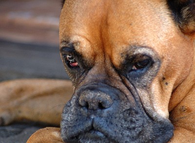 Старый боксер снят на крыльце своего дома.