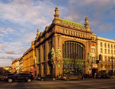 Дом купцов Елисеевых Санкт-Петербург Здание выделяется на фоне классической архитектуры Невского проспекта своими витражами, скульптурами и роскошью отделки. На фасаде установлены скульптуры А. Г. Адамсона «Промышленность», «Торговля», «Искусство» и «Наука». |