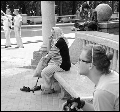 Malakhov, Руки здесь не текст, а примечание к нему (поэтому и мелкий), отрезаны они намеренно... Текст - это бабуля, возле которой стоят мужские ботинки, она ждет (сын ее в это время собирает в фонтане деньги), но мы этого не знаем, в этом и загадка... Все остальное - жизнь вокруг, а руки - это связки, которые подчеркивают определенное действие или состояние этих людей в запечатленный момент... Извините, но это мое видение, философия, если хотите. Я ее не навязываю и судя по рек-ам, меня мало кто понимает, и это радует!!! Не хочу снимать как все красивые пейзажи или постановку, фотография должна быть живой, не поддельной, во всяком случае для меня... Спасибо за внимание и за ваше мнение