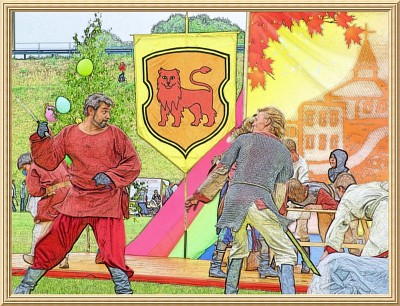 Выступление рыцарей. На заднем плане герб города Городка. Снято второго июля.