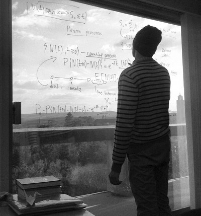 Подозревал, что вы можете прочитать этот снимок в духе юного Жолковского в "Записках Тартусского университета".) Тем более формулы теории вероятности, если знать, что это именно они, дают пищу для воображения и для любой "теории заговора")) Не знаю. Вероятно, все это есть в этом снимке, когда вы его интерпретируете. Для иного читателя - это осень, раннее утро, панорамное окно не в сад, а в открытое пространство с уходящим горизонтом (это важно), и просто математические формулы - как "формулы жизни", красивые визуально и непонятные. И все это волнует не меньше, нежели декодирование формул теории вероятности.) И детали: сложенный из листка бумаги журавлик с надломленным крылом. ) Оптический эффект: лес, поля сквозь вязь математических иероглифов. Сам факт использования оконного стекла для записей - тоже деталь. Смысловая. |