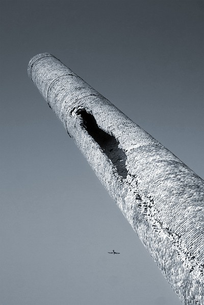 Руины коксохима в г.Стаханов. Труба, разрушена молнией, в ней каким-то образом поселились мелкие хищные птицы, скорее всего кобчики.