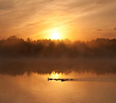 Расствет, спугнутое семейство утков рвет на север... или на юг, фиг их разберешь