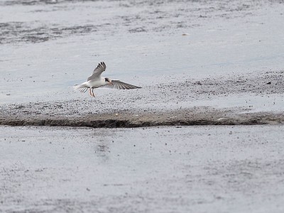 Молодая озёрная чайка, появившаяся на свет в нынешнем году, рыбачит на дне рыбоводческого пруда, воду в котором спустили для очистки дна