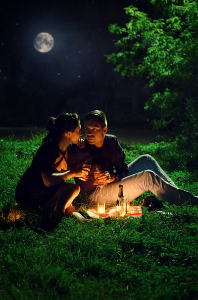 Сказочная ночь Фотография знакомых. В качестве контрового света (подсвечены фигуры и куст на заднем плане) - уличный фонарь. Лица подсвечены свечами в стаканах. Задний план ушел в черное, поэтому пришлось добавить луну со звездами. Применено небольшое тонирование. |