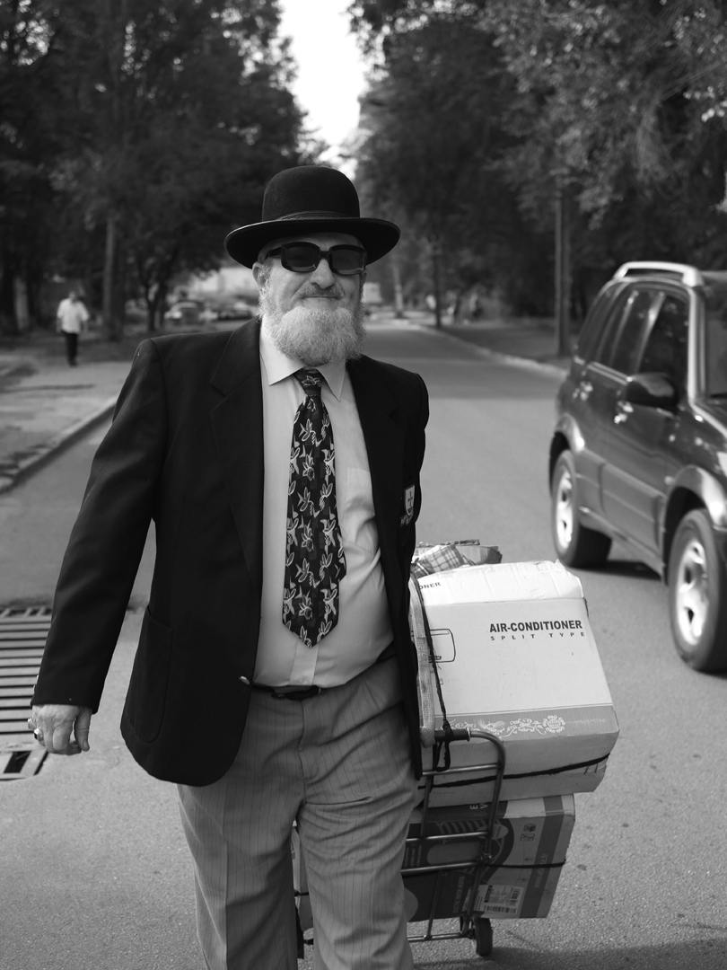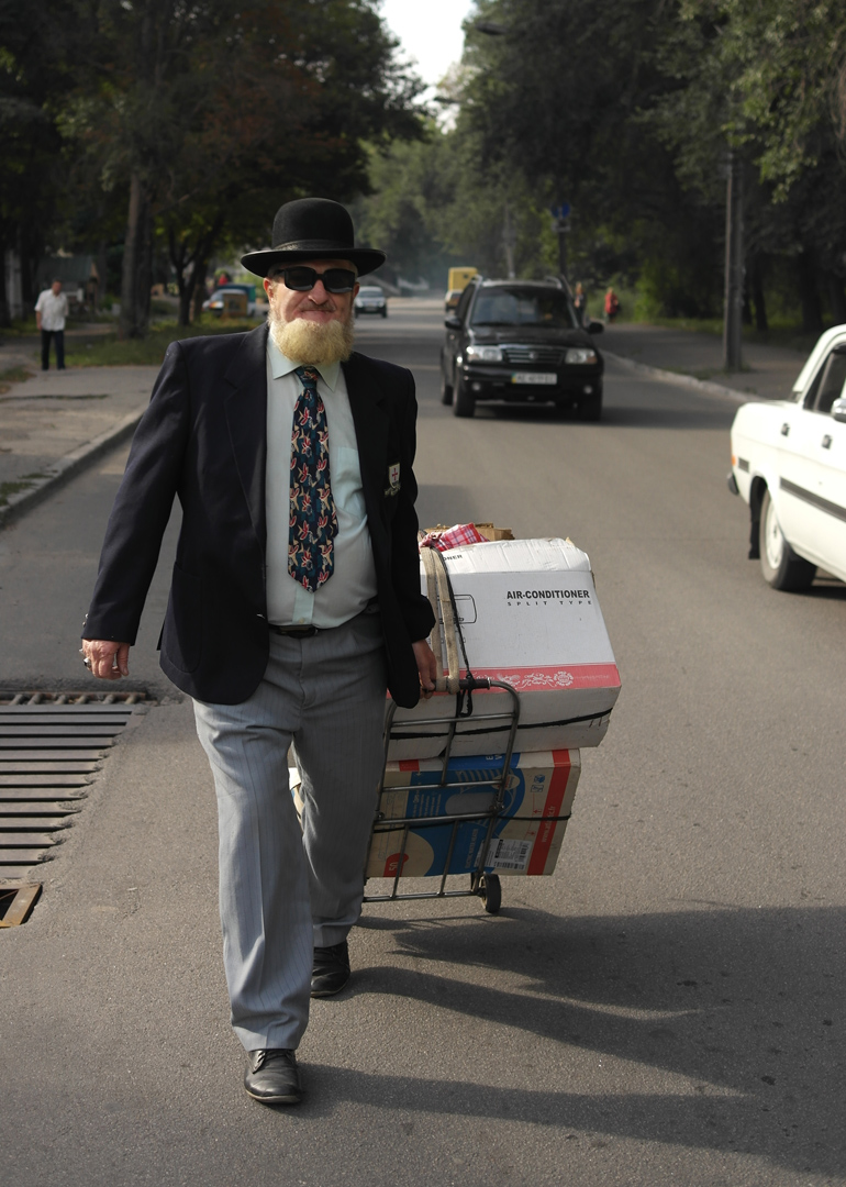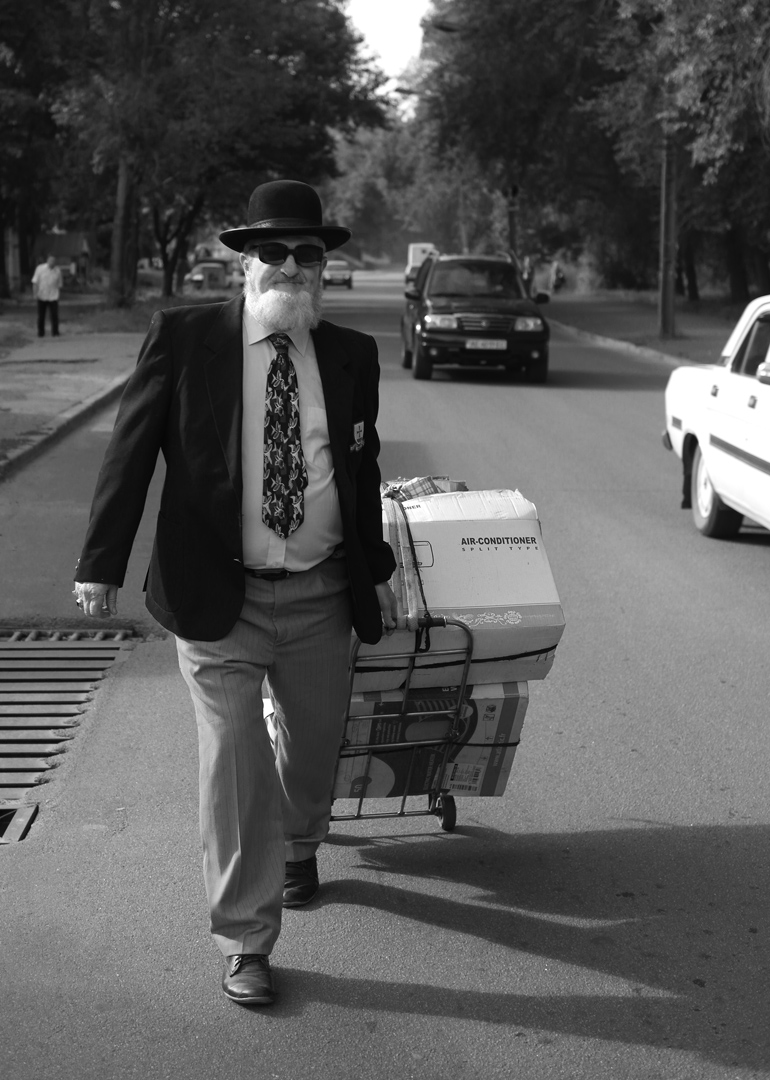 VARASHYLIN, чем именно данный момэнто вас привлёк? скажу сразу-фото сильное и на это имеются основания(неповторимые причём) а как он не мог привлечь. Такой типаж. А галстук, а рубаха, а брюки, а туфли и т.д. На съемку было секунд 5. Успел сделать два кадра. Второй то же интересный. Тень от тележки и его ног образует конский хвост и ноги лошади. |