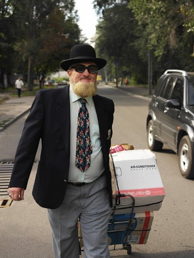 а этот дяденька-занятный: костюм ,пиджак клубный, рубашка, шляпа, кольца, один галстук чего стоит ( у моего отчима такой был, только давно) и тележка с коробками макулатуры - бережёт сырьевые ресурсы страны