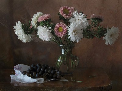 Может, текстуру на основных предметах стоило, все же , стереть? А так виноград получился грязноват, и цветы стали бы еще лучше..