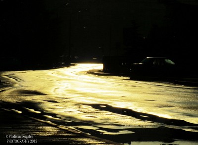 июнь 2012 года, раннее утро, шел на работу, увидел такую картину... Утреннее солнце позолотило мокрую после ночного дождя дорогу. Снято на мыльницу Canon Powershot sx 210 is