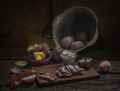 Я не останусь равнодушным, но не соглашусь с Отлично снято! . Я предполагаю, что у вас своя тусовка и мое мнение вам до фени, но тем не менее рискну. Из плюсов: предметы съемки выбраны удачно - и разделочная доска, и фактура стола, и продукты, и задний план - все в плюс. В минус: компоновка кадра и композиция, наклоненная кастрюля-чугунок разрушает достоверность кадра, этот предмет  живет своей жизнью и лишний в кадре, неудачны два яйца справа и слева (визуально равносильны и разрушают композицию), грубая и неаккуратная обработка  . Ну и свет, там есть свет? С наилучшими пожеланиями, успехов!!!