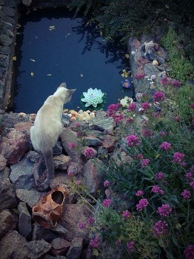 Ну хорошо: кошка и лилия...но тогда сиреневые цветы и разбитая амфора получаются лишними, т.к. отвлекают все внимание на себя.