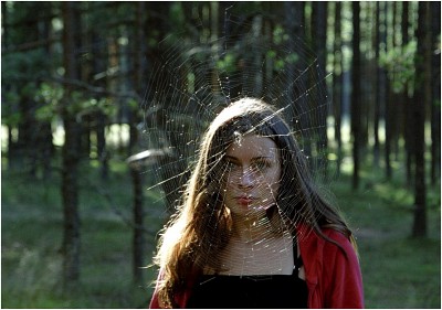 Walterkid, Валер,главный тут сам персонаж в паутине,ЗП тут второстепенен,а ён перетягиват на себя - его надо сильно темнить,без пересветов,шоб тока был намек на дерева,с лицом и паутиной тож трэба работать,из света шо лежит по левую сторону головы я бы делал лунный ближе к синьке....но тут вдруг вспомнил - у тя же нету хвотошопу,а без его тут ну никак....попробуй просто сильно виньетировать в темноту - примерно так