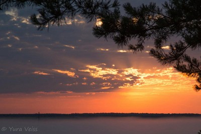 Весьма оргинальный кадр. Даже затрудняюсь припомнить, есть ли что-то похожее в тех сотнях тысяч рассветах над водоемамаи, которыми полон интернет. Тут и туман, и ветви сосны, и даже кустик какой-то получил свою долю внимания. Ничто не сукользнуло от пытливого взгляда фотографа!