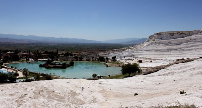 Голубое озеро Памуккале. За исключением специально выделенной для туристов зоны, ходить по травертинам нельзя, так как они очень хрупкие. Тем не менее, есть специально выделенная территория, где в травертинах можно даже купаться (бесплатно) . Также для купания открыт бассейн Клеопатры (20 турецких лир) . В данный момент идёт строительство басейнов для купания у подножья и после постройки через год-два планируется полностью запретить туристам доступ на травертины. |
