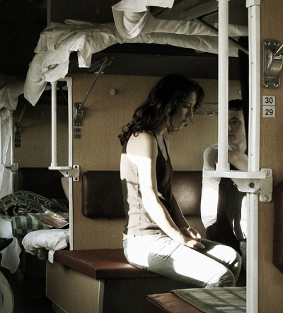 Парень не нравится (было бы лучше без него) Он не цельный, он развалившийся пазл (поручень через нос и губы, часть локтя, тень от девушки). Он часть бардака из поручней, матрацев, мятых простыней. И в тоже время его нельзя причислить к бардаку вещей, он одушевленный и активно находится в пространстве девушке. Органичнее для этого кадра было бы, если бы девушка была в бардаке вагона одна ...