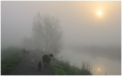 Sheep in the foggy morning.