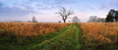 Красота, зеленая дорога так хорошо вписывается в желтую траву, туман и старое ветвистое дерево все сошлось. Картина!