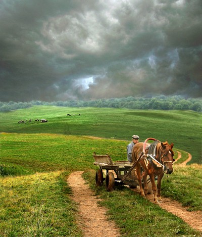Виктор слишком не равномерный переход между небом и деревьями на ЗП. ИМХО картинка будет более эффектной если притемнить деревья и часть кадра до повозки,