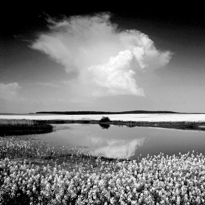 Загроможденное и не сбалансированное фото: доминантная кочка строго по центру, облако по центру, кусты и облачко слева без противовеса. Множество разнородных сущностей: травки, полоски, отражения, вода, поля, леса. И вся эта эклектика никак не упорядочена ни в какие паттерны и не объединена никакой идеей. Избыточный контраст.