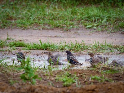 Прошел дождик и придорожная лужа превратилась в купальню для молодых скворцов