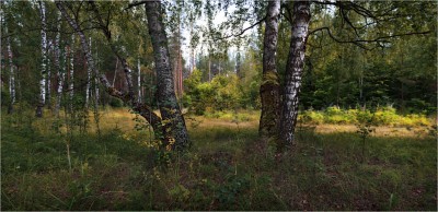 Александр Сапожников, Это панорама из семи вертикальных кадров, снималась при открытой полностью диафрагмой, цель была отделить березы от фона. Левая сторона была ближе к камере чем правая, вот и все )