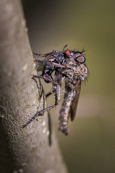 Большой Дьявол - Ктырь гиганский Все в их облике говорит о приспособлении к хищничеству. Острота выпуклых глаз, глубоко разделенных теменем, настолько велика, что к сидящим ктырям трудно подойти незамеченным. Хотя в их хоботке отсутствуют мандибулы, другие части ротового аппарата — максиллы, подглоточник и нижняя губа — образуют весьма совершенный колющий орган. От яда в слюне ктырей насекомые-жертвы умирают мгновенно. |