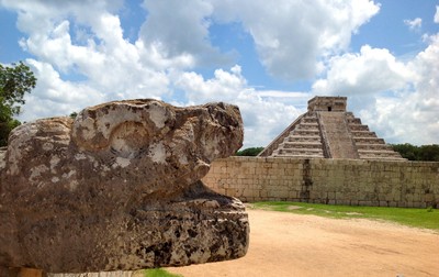 Головная ягуара и Пирамида Кукулкан в Археологической зоне Чичен-Ица (Юкатан, Мексика)