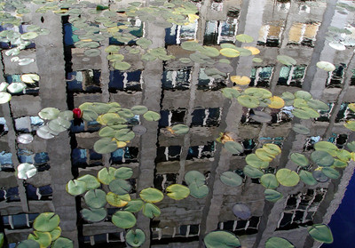 отражение здания в пруду с кувшинками