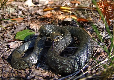 Милашка! Обычный вроде уж, но позирует как гюрза. Очень опасен!