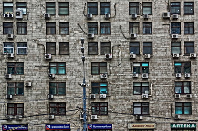 Вот ведь за каждым окном своя жизнь, разные судьбы и истории людей.. сколько всего, а на картинке только и видны ящики на веревочках, похожие на оторвавшиеся пуговицы на одежде с этикеткой "Промсвязьбанк".. Интересная фотография.