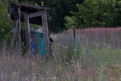 дверная рама ломает пространство своей непараллельностью основной конструкции. И в этом ином пространстве - и цвет иной, голубой - в бирюзу почти, синий с красным проблеском.
